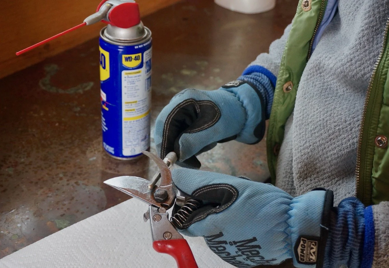 It’s easy to sharpen and clean tools. You’ll need a spray can of WD-40, a sharpening stone and disinfectant like Simple Green. My friend Nellie Gardner made a great how-to video about sharpening tools that you can watch here.
