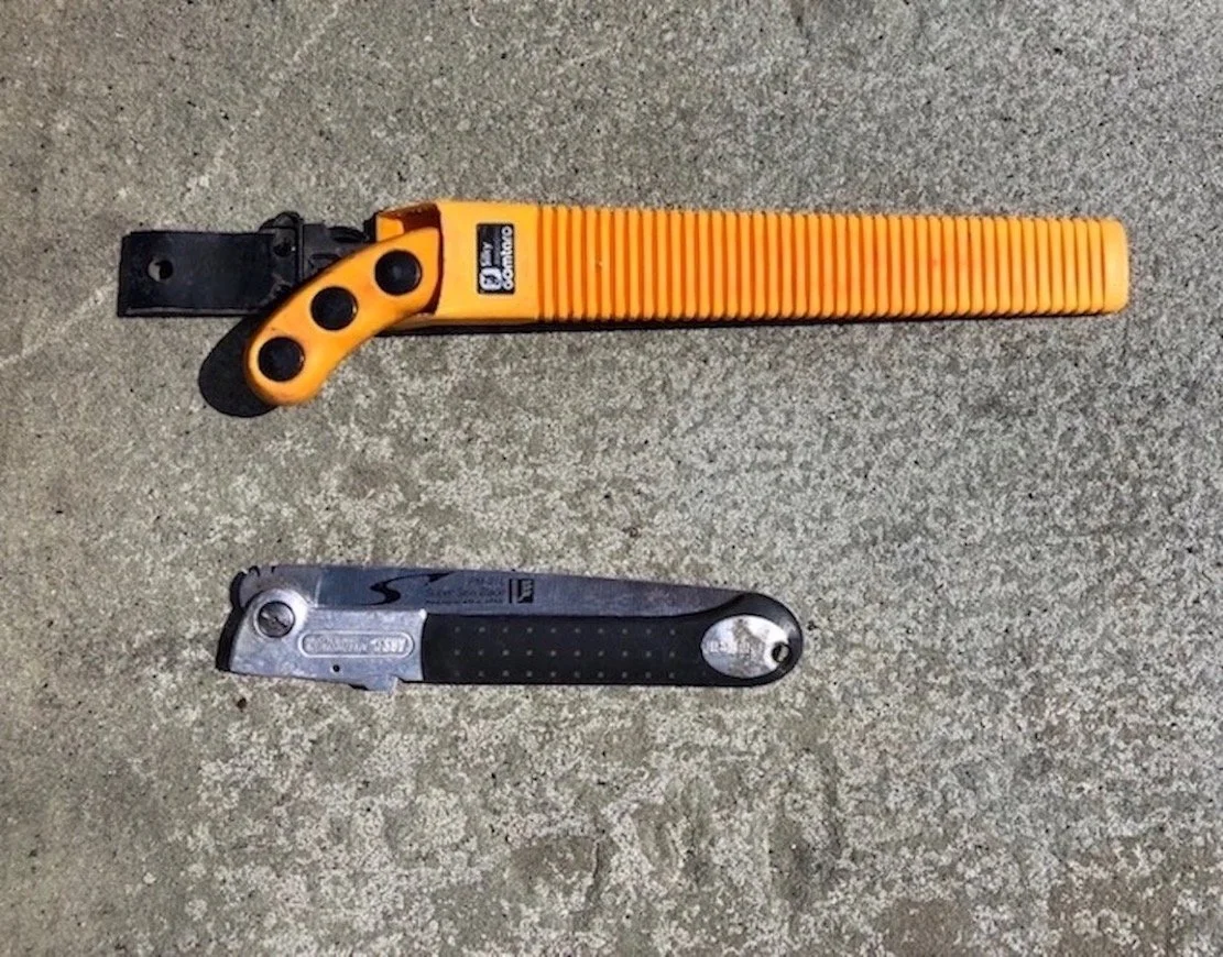 Smaller folding saws like the black and silver ARS variety (above photo) are a must have in your arsenal of tools. They’re a little easier to use in tight areas and easy to carry around in a holster - very handy when you’re climbing up a ladder to prune for a far reaching branch. Both Felco, ARS and Silky offer a wide variety of sizes to suit any need with prices ranging from $75 and up.